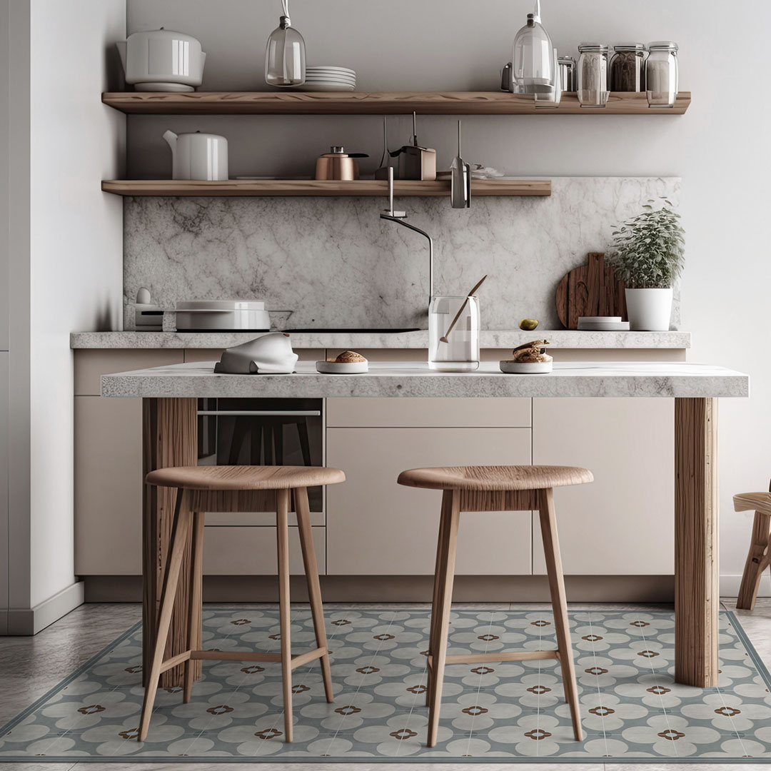 De nuevo las baldosas hidráulicas vuelven a ser protagonistas de los diseños de alfombras de vinilo de Lakkua. En esta ocasión, unos azulejos que crean una composición con motivos florales y que cuentan con un enmarcado perimetral que delimita el espacio de la alfombra.